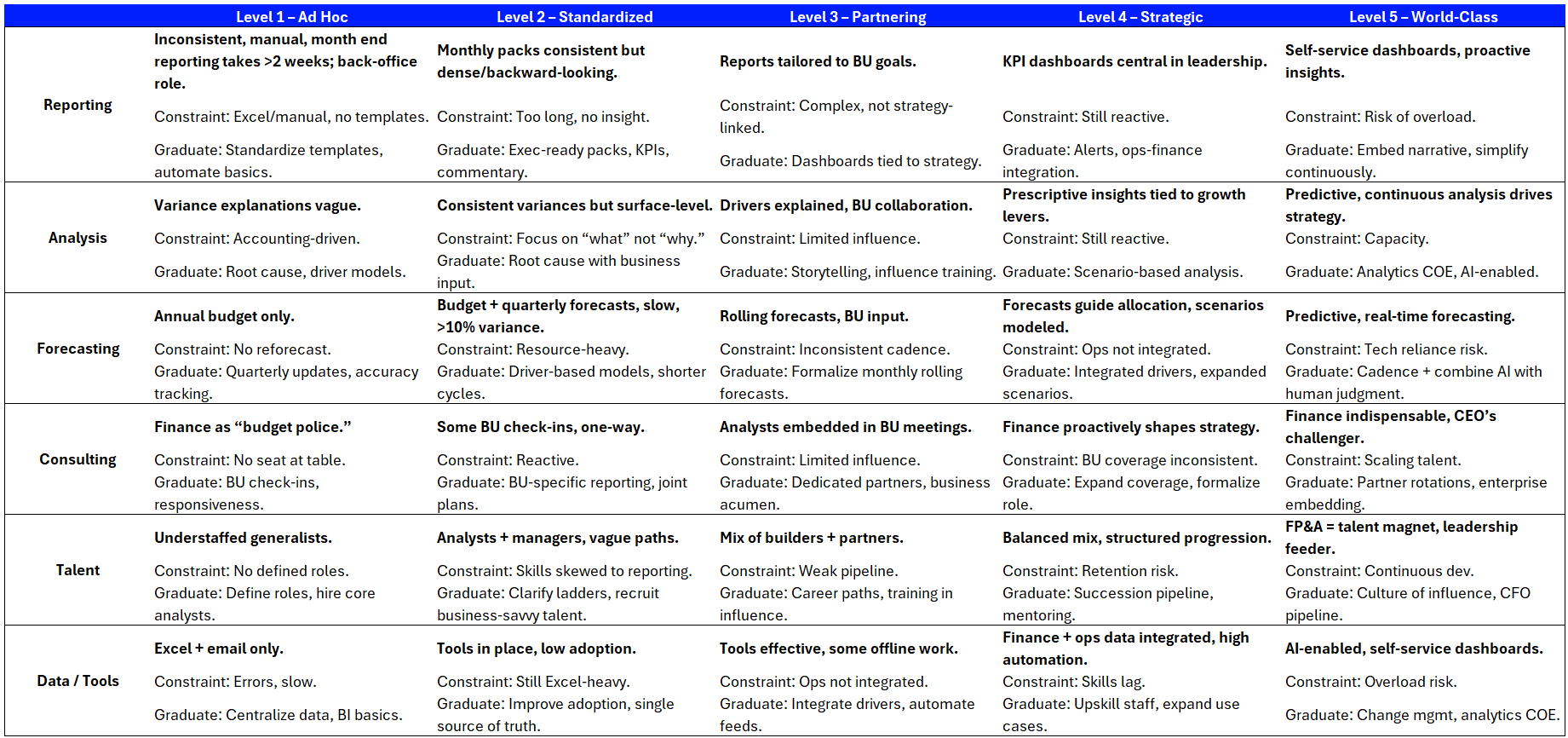 It’s the 6 core aspects of my FP&A OS playbook broken out across 5 levels of maturity: ad hoc, standardized, partnering, strategic, and world-class.